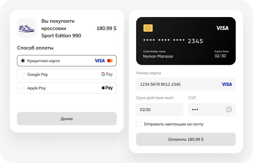 • Удобство для клиентов: оплата проходит без редиректов и промежуточных страниц — это повышает лояльность к вашему сайту.